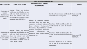 Residentes no Brasil (pessoas físicas e jurídicas) que possuam bens e/ou direitos no exterior devem apresentar declarações periódicas ao Banco Central do Brasil, por meio do sistema de declaração de CBE (Capitais Brasileiros no Exterior).