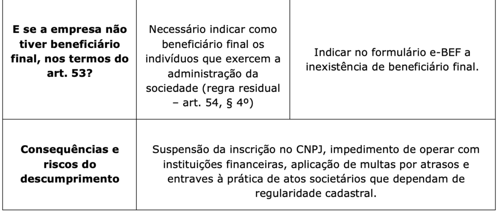 Como regra residual, e somente para entidades domiciliadas no Brasil, a norma esclarece de forma expressa que, exclusivamente na hipótese de não ser possível identificar qualquer pessoa natural que se enquadre nesses critérios, deverão ser informados como beneficiários finais os indivíduos que exercem a administração da entidade.